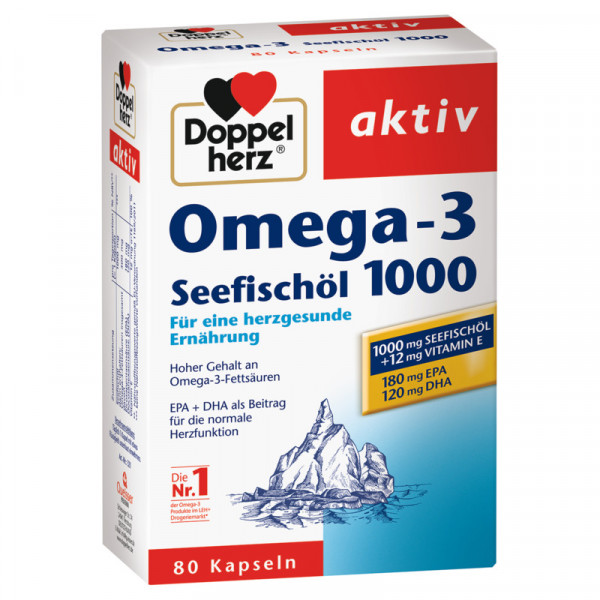 Doppel Herz Omega-3 Olio di pesce di mare 1000mg 80 Capsule contengono olio di pesce di mare, composto per il 30 % da acidi grassi omega-3.
