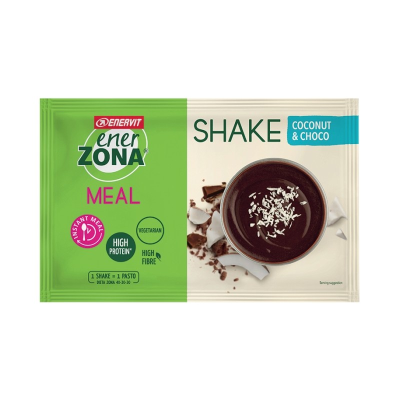 Enervit Enerzona Instant Meal è uno shake a base di proteine vegetali del pisello, cacao e fruttosio e con cocco essiccato in scaglie.
